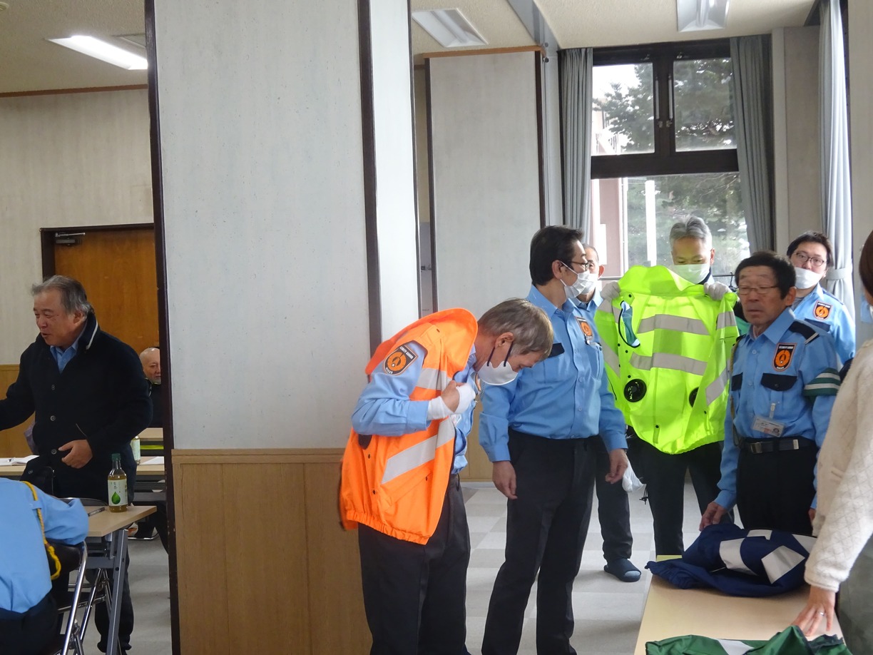 次年度から熱中症対策の一環として貸与する空調ベストの試着会を行い、皆さん興味津々に試着を行っていました。